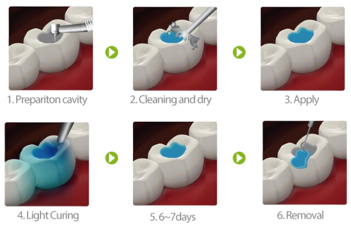 Transcen Temp In & Onlay LC, paralel duvarlara sahip derin inley ve onlay hazırlıkları ve ayrıca implant vidası erişim kanallarının kapatılması için önerilir