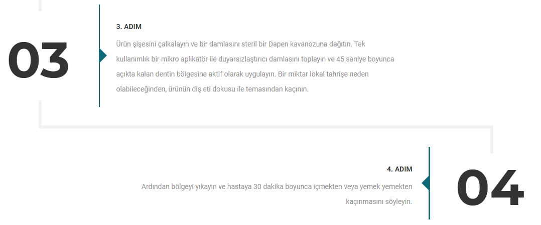 Özel formülü, sinir hücresi zarının depolarizasyonu yoluyla ağrının sinir uyaranını bloke etmenin yanı sıra, kanalikülleri yok eden proteinlerin çökeltilmesi yoluyla dentin geçirgenliğini azaltabilir.