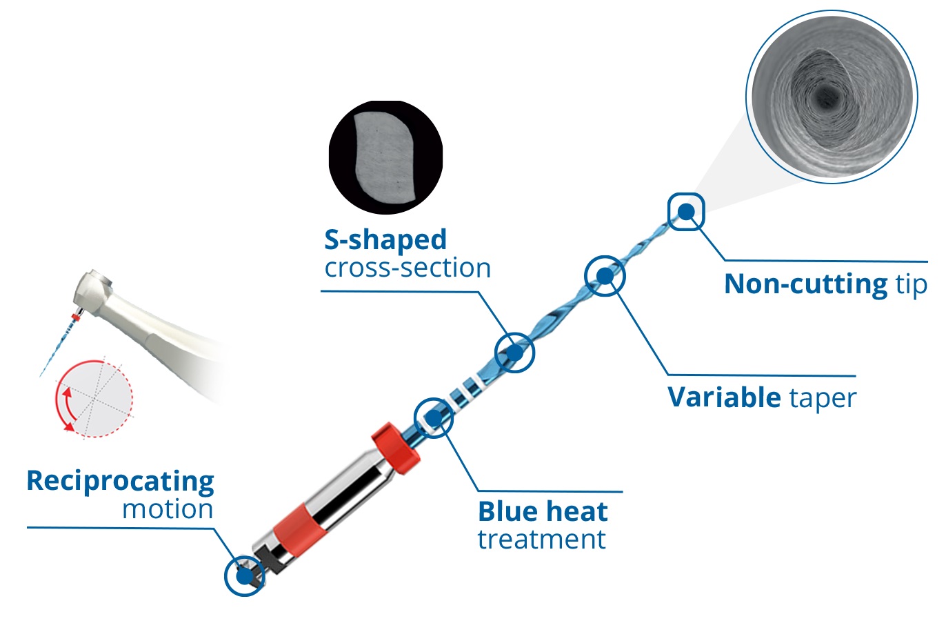Yenilikçi bir ısı tedavisi, kanalda daha güvenli ilerleme ve daha pürüzsüzlük sağlama ve onun karakteristik mavi rengini ek olarak vermek için RECİPROC Blue yu RECİPROC'tan daha esnek yapar
