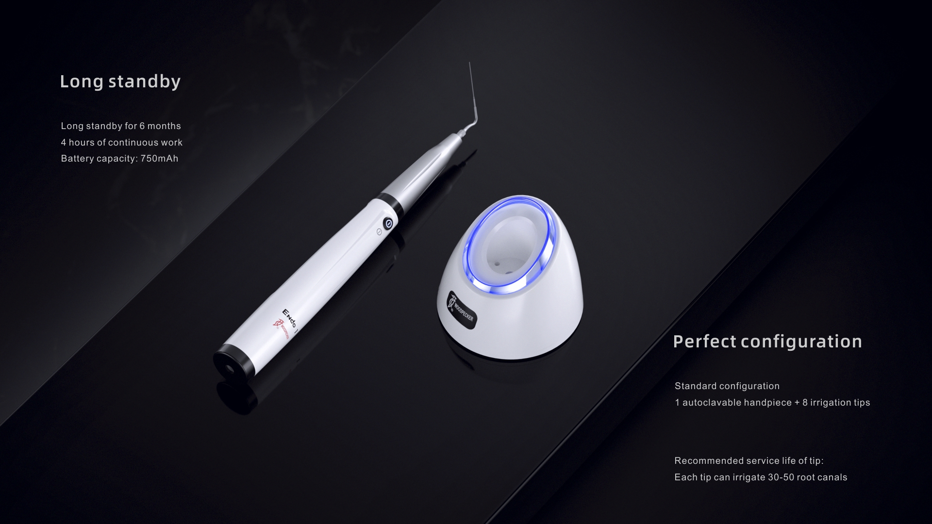 45 khz yüksek frekanslı ultrasonik vibrasyon ile yıkama sıvısı akustik akısın etkisi ile irigasyon üst ucunun 3 mm altına ulasabilir ve bu sayede kök kanalındaki kimyasal kalıntıları iyi bir sekilde temizler