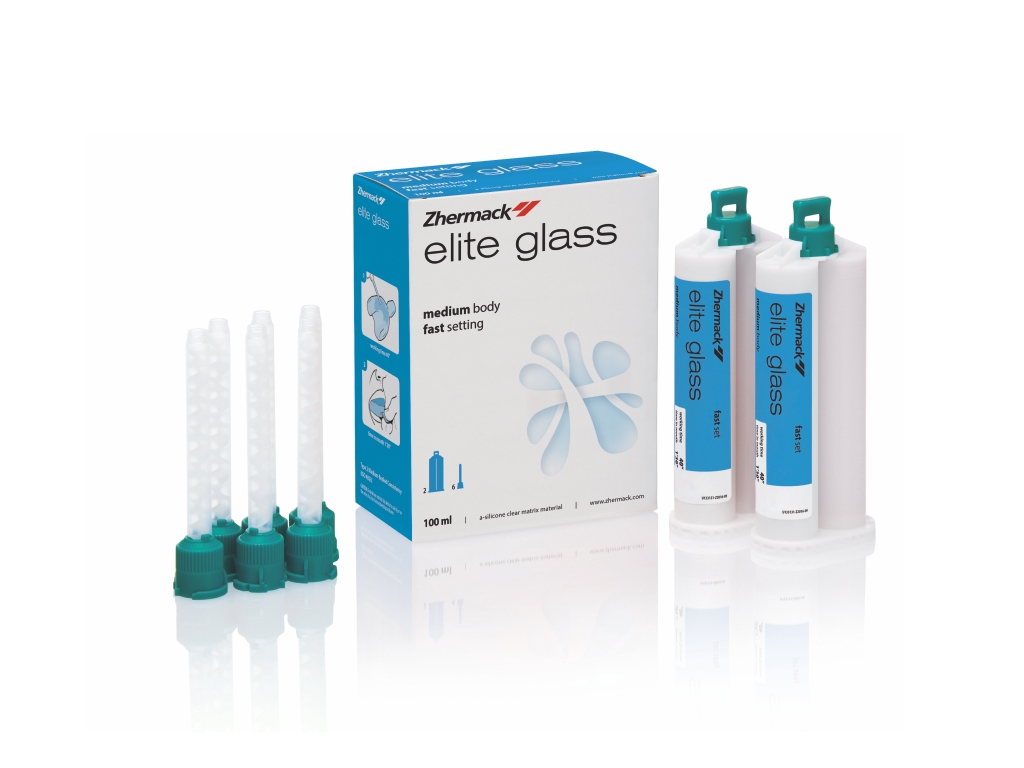 Zhermack Elite Glass Direkt estetik restorasyonlarda transparan matris yapımında kullanılan şeffaf A-Silikon ölçü maddesi.